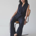 The Wrap Vest combines sharp tailoring with a feminine sensibility. The waist tie cinches this vest in at the waist for a flattering look. Using soft, lustrous Linen Rayon, this piece is breathable, regulates body temperature well and does not crease easily. Pair this as a co-ord suiting set with the matching Elongate Elastic Pants.