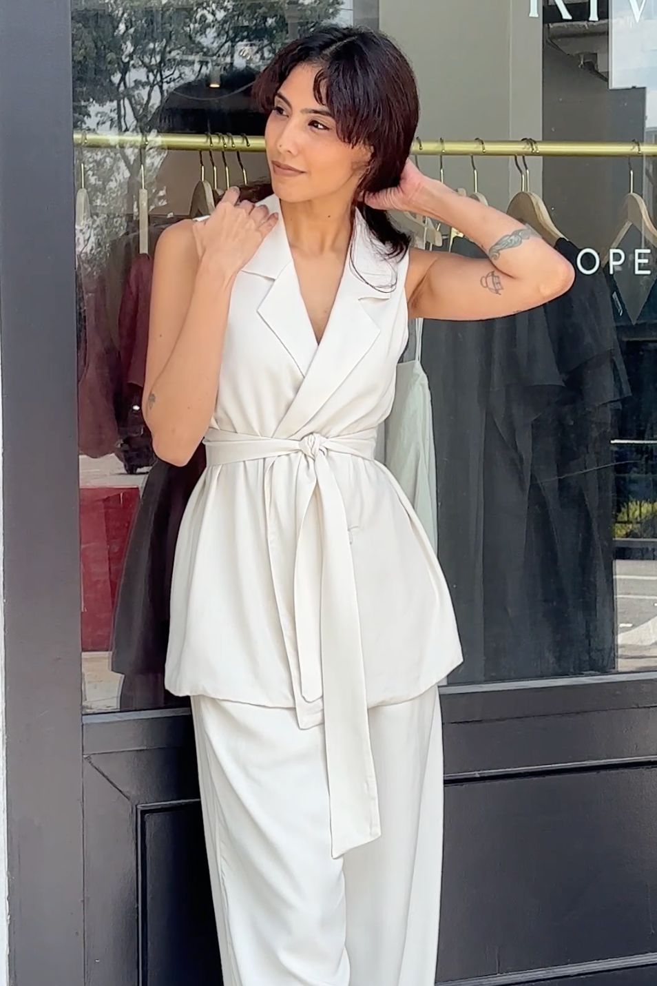 Made from a breathable linen-rayon blend that resists creasing, the Wrap Vest features sharp tailoring softened by feminine lines. The hidden front closure and adjustable waist tie let you define your shape, while the clean cut layers beautifully over shirts, dresses, or our Elongate Elastic Pants—making it a seasonless staple for purposeful layering