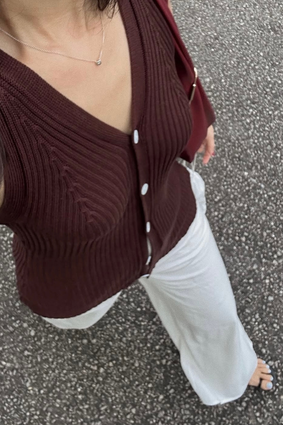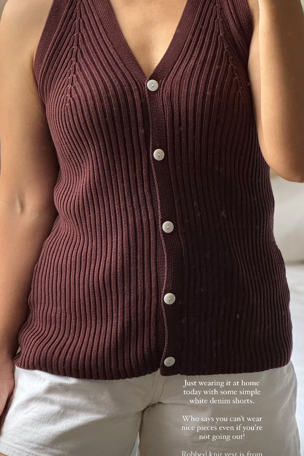 This sleeveless knit vest is crafted from breathable TENCEL with a soft ribbed texture and a flattering V-neckline. Designed for easy layering, it pairs beautifully over shirts, under blazers, or worn solo for a minimalist look. The slightly relaxed cut and midweight knit make it ideal for both transitional weather and all-day comfort — a versatile piece with timeless appeal.