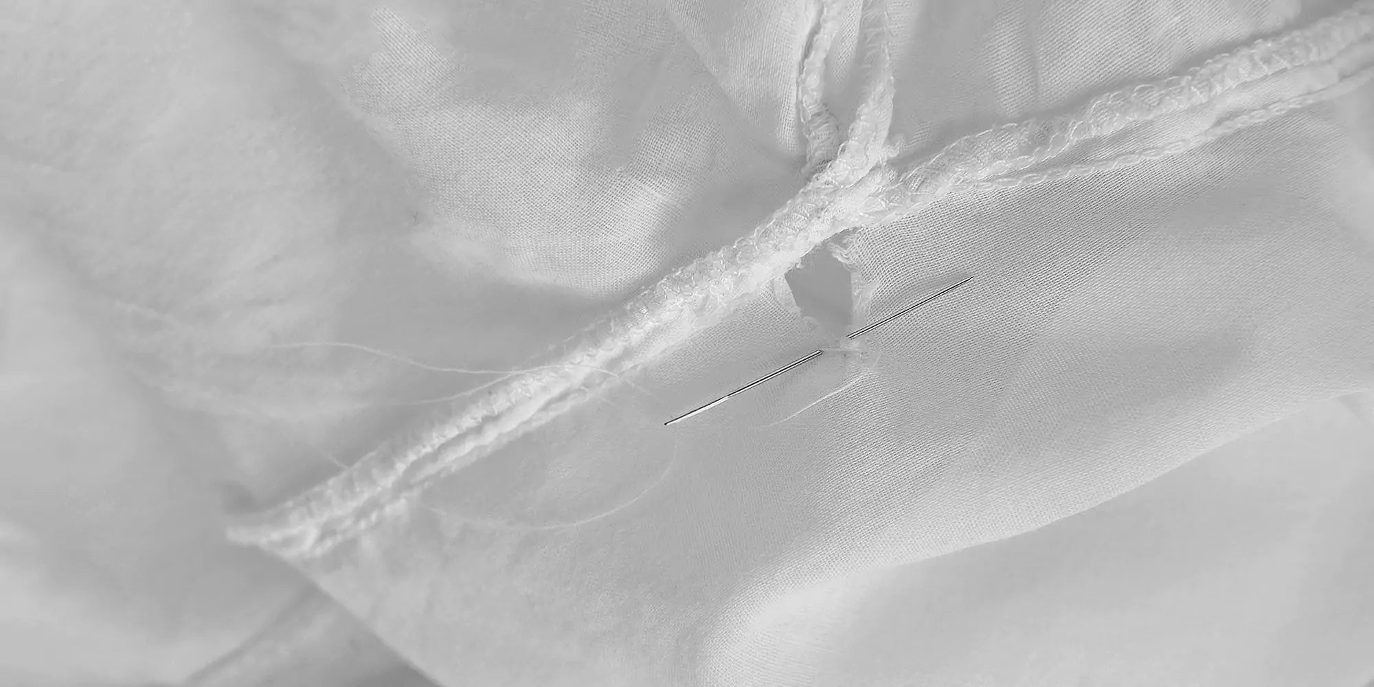 We may offer visible mending for larger rips or stains. This method of using hand-sewing is about valuing and extending the life of the garment by not only strengthening it, but taking the time to make it beautiful as well. This service is bespoke for a small fee.